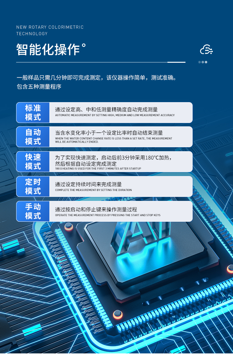 環(huán)狀的鹵素燈確保樣品得到均勻加熱,操作簡便、測量準確。水分測定儀在測量樣品重量的同時,儀器采用環(huán)形管鹵素加熱方式,快速干燥樣品,在干燥過程中,水分儀持續(xù)測量并即時顯示樣品丟失的水分含量%,干燥程序完成后,*終測定的水分含量值被鎖定顯示。與**烘箱加熱法相比,鹵素加熱可以在高溫下將樣品均勻地快速干燥,樣品表面不易受損,其檢測結(jié)果與國標烘箱法具有良好的一致性,具有可替代性,且檢測效率遠遠高于烘箱法。智能化操作,一般樣品只需幾分鐘即可完成測定。該儀器操作簡單,測試準確,顯示部分采用液晶顯示屏-使屏幕更加清晰明亮,示值清晰可見,分別可顯示水分值,樣品初值,終值,測定時間,溫度初值,*終值等數(shù)據(jù),并具有與計算機,打印機連接功能、符合GLP規(guī)范的打印數(shù)據(jù)輸出。
