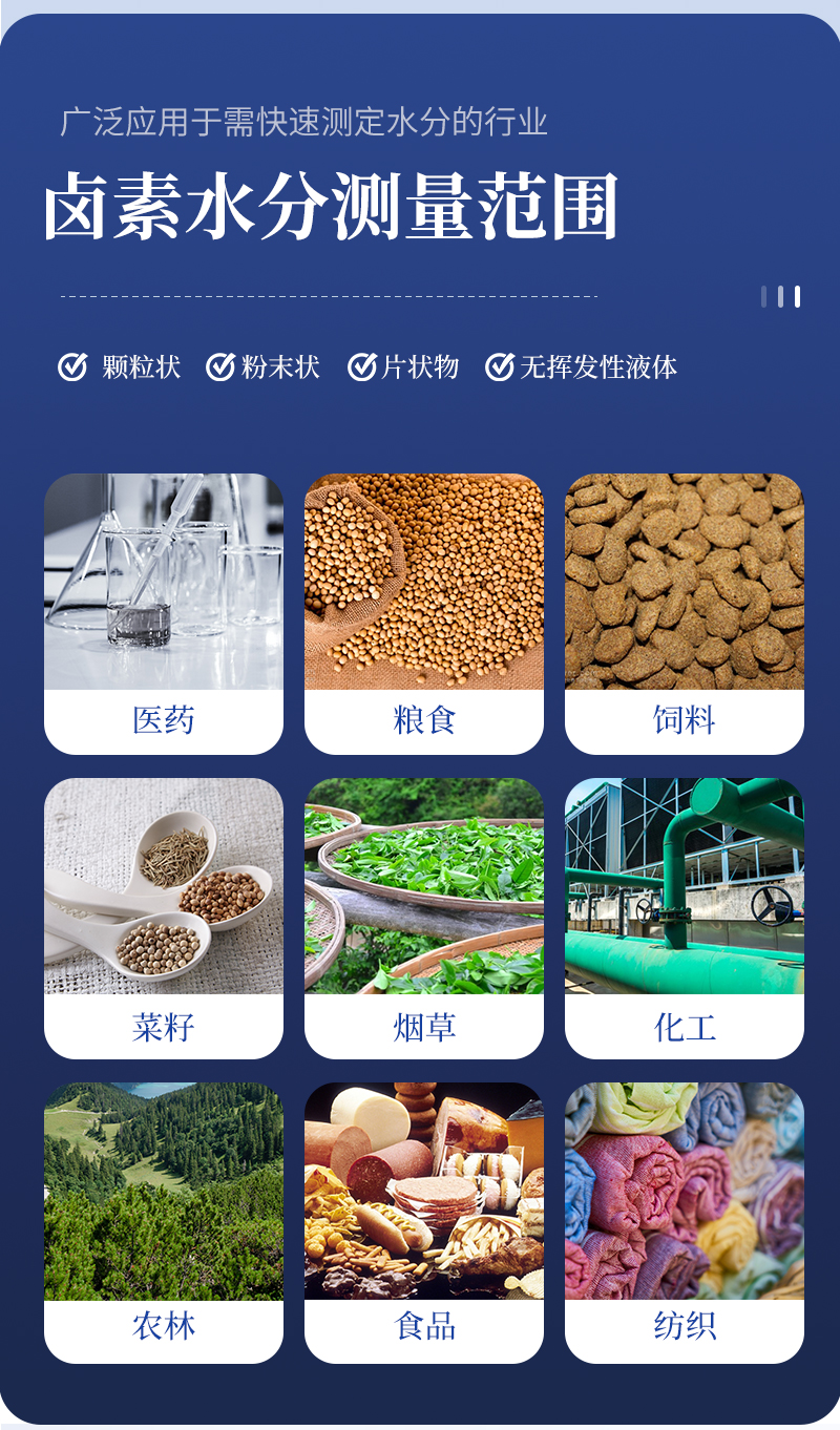 可廣泛應(yīng)用于一切需要快速測定水分的行業(yè),如醫(yī)藥,糧食、飼料、種子,菜籽,脫水蔬菜、煙草,化工,茶葉,食品、肉類以及紡織,農(nóng)林、造紙、橡膠、塑膠、紡織等行業(yè)中的實驗室與生產(chǎn)過程中。同時滿足固體、顆粒、粉末、膠狀體及液體含水率的測定要求