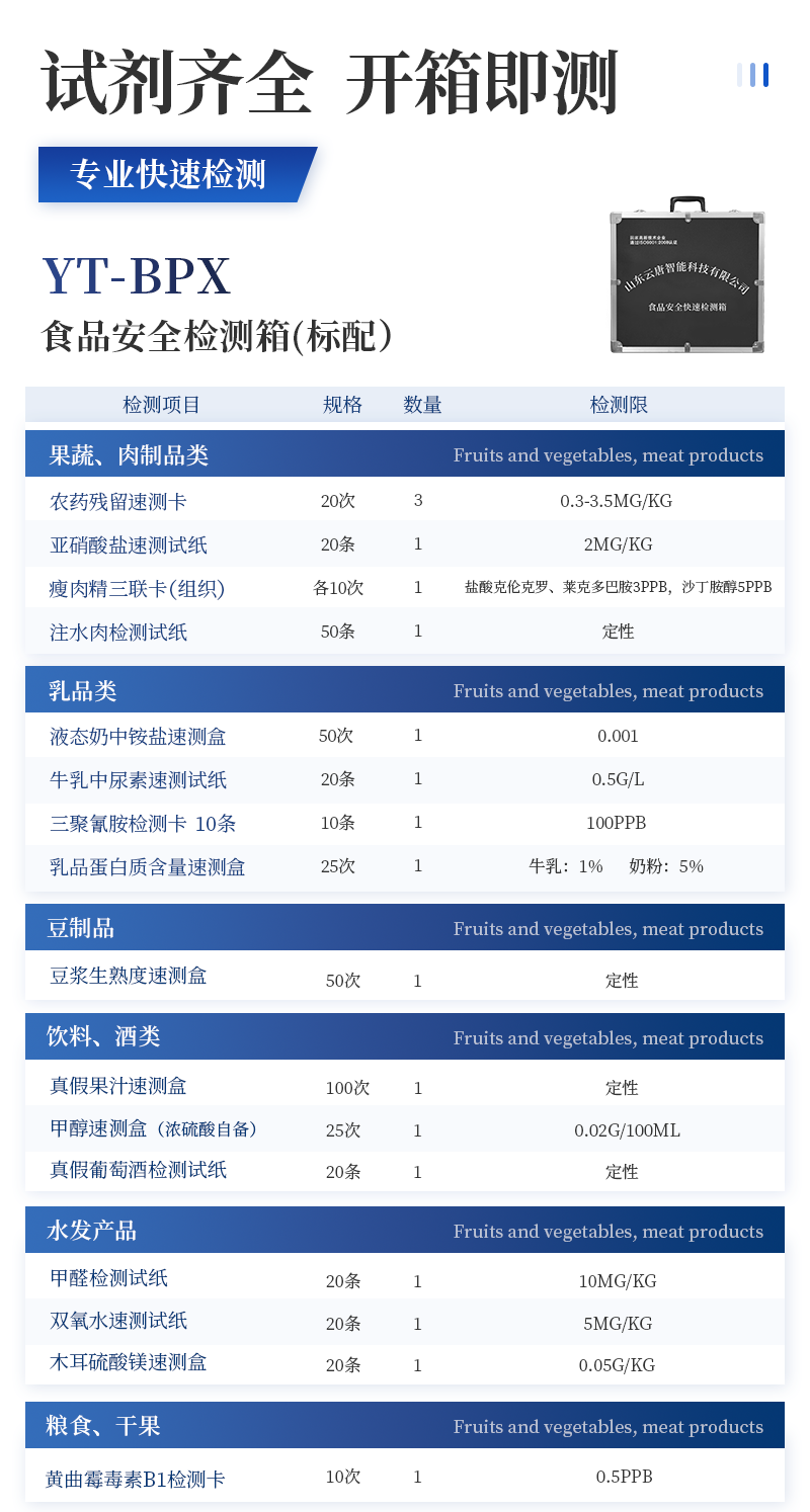 | 硼酸和硼砂速測盒 | 100次 | 盒 | 1 | 25mg/kg | 定性 | ||