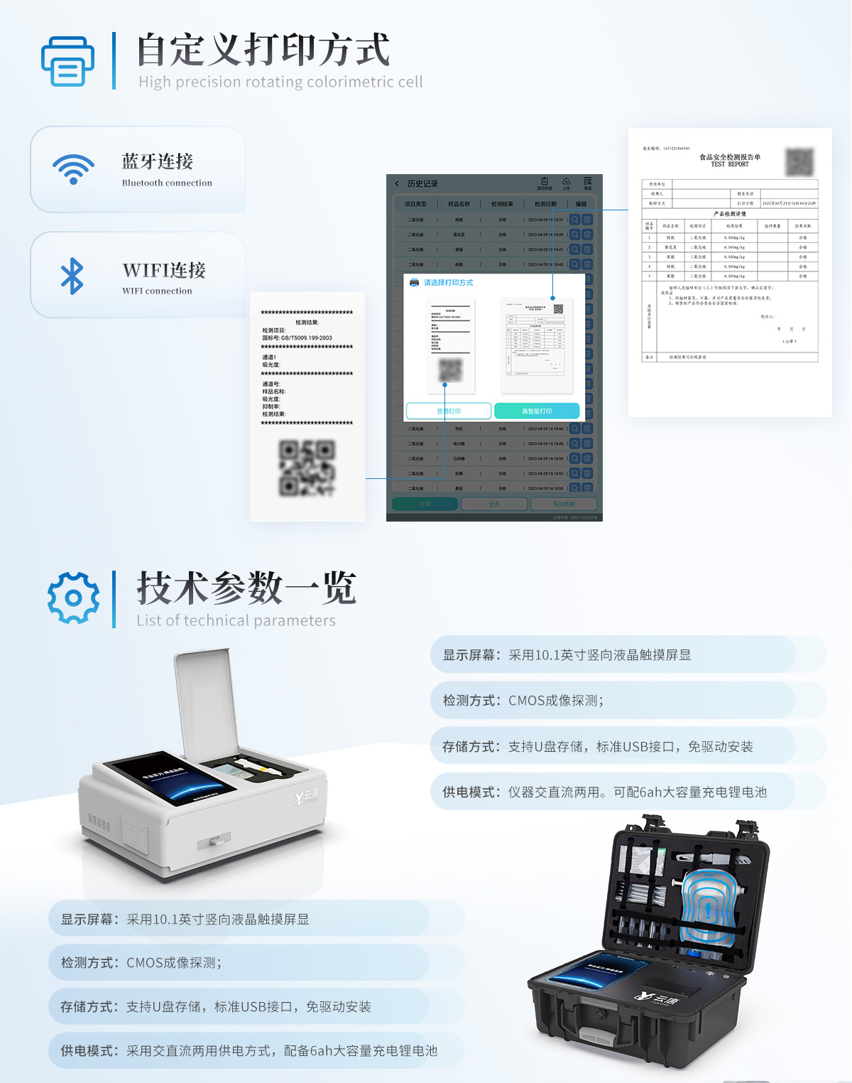 1、儀器采用10.1英寸液晶觸摸屏顯,搭配運行安卓智能操作系統(tǒng),主控芯片采用ARM Cortex-A7,RK3288/4核處理器,主頻1.88Ghz,運轉(zhuǎn)速度更快速,性能更強。2、儀器功能包括:膠體金檢測模塊、數(shù)字化管理模塊、無線通訊模塊等,可以滿足同一軟件下實現(xiàn)所有檢測項目的檢測,并在同一窗口展示檢測結(jié)果。3.一體化便攜式快檢設(shè)備,采用交直流兩用供電方式,可連接車載電源,配備6ah大容量充電鋰電池,可以滿足現(xiàn)場及流動檢測使用的需求。儀器尺寸:43×35×20cm,   主機凈重:5.1kg4、系統(tǒng)自帶數(shù)據(jù)集成模塊,設(shè)備首頁自動統(tǒng)計檢測數(shù)據(jù)包含:周檢測數(shù)據(jù)、月檢測數(shù)據(jù),全部檢測總數(shù)量,均包含檢測總數(shù),合格數(shù),不合格數(shù),以及相關(guān)柱形分析圖,對各項檢測數(shù)據(jù)清晰掌握,無需電腦查詢,更加快捷直觀。5、儀器具有任務(wù)預(yù)設(shè)模塊,可在樣品送檢前提前預(yù)設(shè)樣品名稱、檢測指標(biāo)、送檢單位等信息,樣品送檢時一鍵調(diào)取保存信息,檢測更加方便快捷。6、膠體金檢測模塊:軌道式自動傳輸掃描方式,可實時顯示金標(biāo)卡實時圖像,系統(tǒng)自動分析并呈現(xiàn)出CT曲線圖,CT線自動識別,無需手動調(diào)整,完成檢測后自動退出檢測卡。結(jié)果判定線可修改,對照值標(biāo)定值可保存,斷電不丟失數(shù)據(jù)。兼容市場上其他膠體金卡,使用耗材不受限制,極大增強用戶使用體驗。7、儀器檢測系統(tǒng)擁有龐大數(shù)據(jù)庫,并且構(gòu)建了完善的檢索、修訂功能。食品庫涵蓋多種樣品名稱,可按需添加或刪除、編輯樣品名稱;產(chǎn)品數(shù)據(jù)庫以及歷史檢測記錄支持一鍵檢索功能。8、系統(tǒng)打印自定義化,打印格式多樣化,產(chǎn)品合格證(國家標(biāo)準(zhǔn)要求),二維碼,抽樣信息、檢測信息,受檢信息、復(fù)核信息、抽樣日期、檢測日期等信息結(jié)果,可按需求自行設(shè)置打印內(nèi)容。9、A4紙版本報告打印功能(可選配):設(shè)備擁有兩種結(jié)果展示方式,可以自動生成A4打印模板和小票打印模板兩種樣式,可通過WiFi及網(wǎng)線等方式鏈接外置打印機可進行打印10、儀器具有 wifi 聯(lián)網(wǎng)上傳、RJ45網(wǎng)線連接功能,可以快速上傳數(shù)據(jù)。同步對接監(jiān)管平臺,數(shù)據(jù)可局域網(wǎng)和互聯(lián)網(wǎng)數(shù)據(jù)上傳,檢測結(jié)果直接傳至食品安全監(jiān)管平臺。進行區(qū)域食品安全監(jiān)管及大數(shù)據(jù)分析處理與數(shù)據(jù)統(tǒng)計,檢測區(qū)域食品安全長短期動態(tài),達到食品安全問題預(yù)估、預(yù)警。11、設(shè)備支持U盤存儲,標(biāo)準(zhǔn)USB接口,免驅(qū)動安裝。檢測結(jié)果存儲容量20萬條以上,可生成Excel表格,進行一鍵拷貝,并具有登錄保護功能,可設(shè)置用戶名及密碼,規(guī)范不同人員操作權(quán)限,防止非工作人員操作,并且可以進行重新校準(zhǔn)、鎖定、恢復(fù)出廠設(shè)置功能。儀器固件可升級,后期檢測項目可擴充。12、儀器具備遠(yuǎn)程升級功能,可定向分客戶分儀器更新,開機后自動更新,并可持續(xù)性免費更新系統(tǒng)版本,無需像傳統(tǒng)產(chǎn)品返廠更新,節(jié)省時間及人力成本并避免了物流運輸返廠升級導(dǎo)致設(shè)備損壞的潛在風(fēng)險。