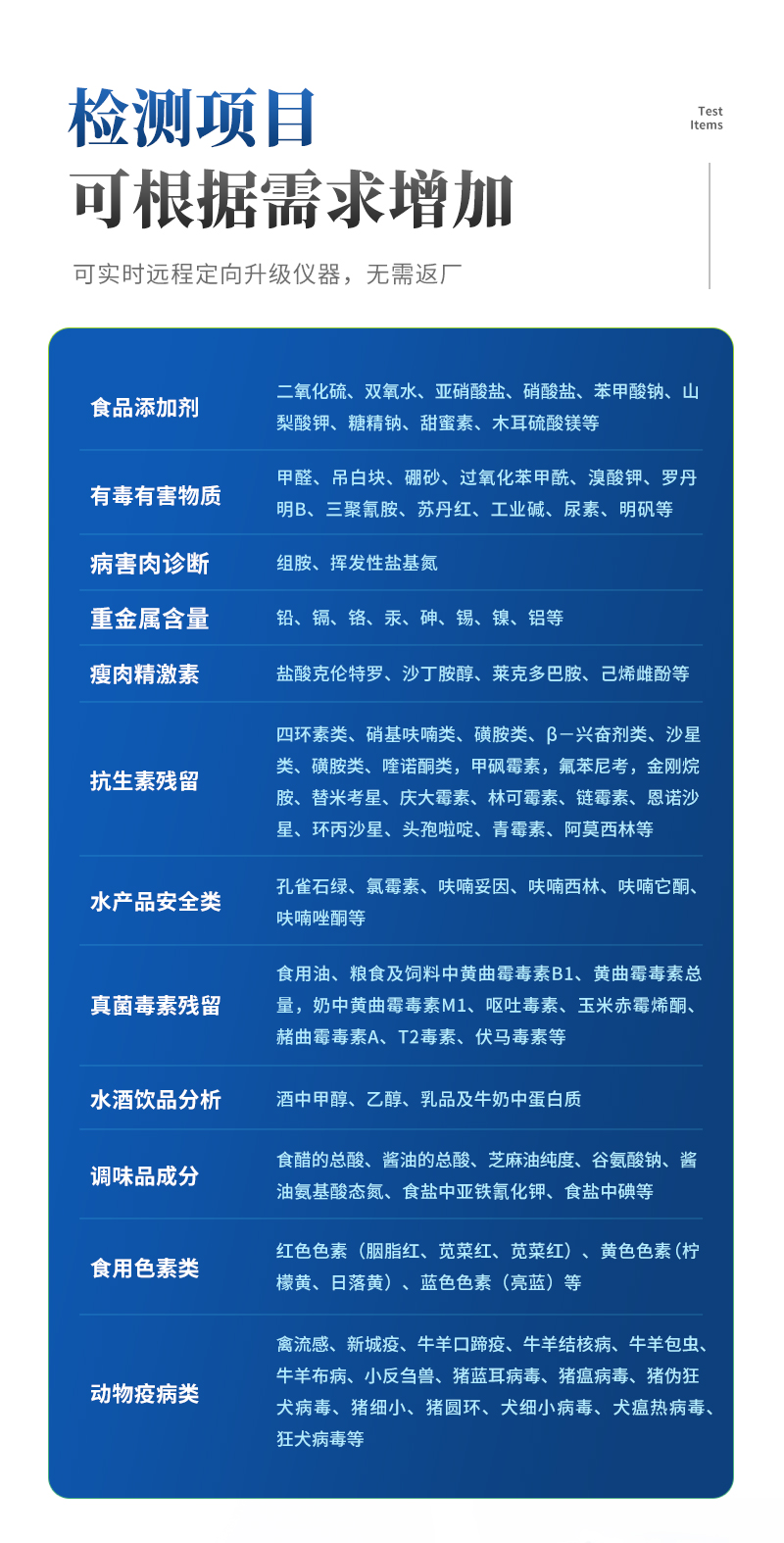 2、儀器檢測(cè)模塊標(biāo)準(zhǔn)化、智能化,檢測(cè)項(xiàng)目可隨意自由組合。檢測(cè)箱體內(nèi)置多個(gè)標(biāo)準(zhǔn)檢測(cè)單元,檢測(cè)模塊可以調(diào)整配置。