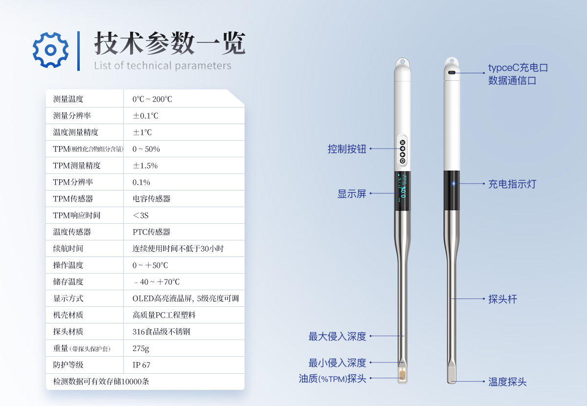 食用油脂是人們攝取能量和營養(yǎng)的重要來源,是加工食品的重要原料。油炸食品以其特有風味廣受消費者喜歡。用于煎炸的食用油在高溫煎炸過程中發(fā)生一系列的物理、化學變化,這些變化會生成對身體健康有害的物質。目前,煎炸食用油的傳統(tǒng)檢測方法多為化學方法,這些方法必須在實驗室內由專業(yè)人員操作,費時費力,化學試劑的使用可能會傷害檢測人員健康,且化學廢劑污染了環(huán)境。YT-SYP是一種快速,安全,**食用油品質檢測儀,能夠快速檢測食用油中的極性化合物組分含量。本產品能夠在油溫較高的環(huán)境下使用,適用于各種煎炸的食用油品質檢驗。