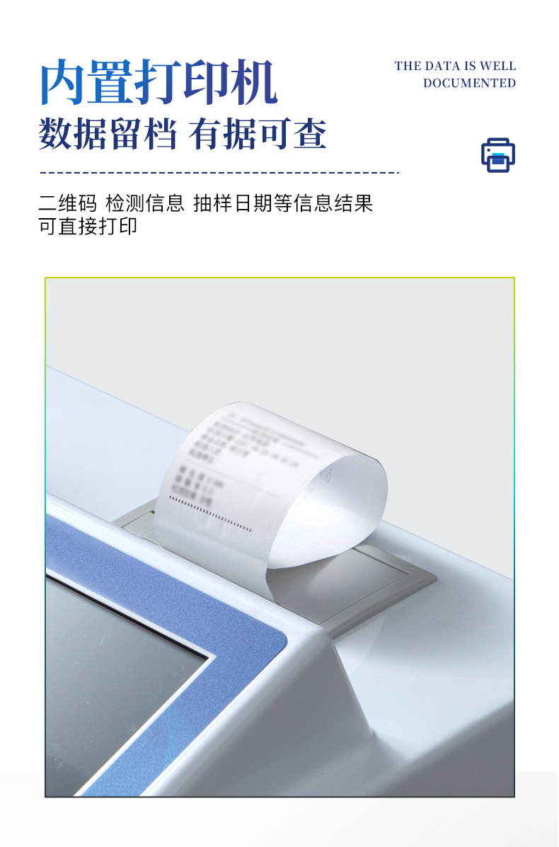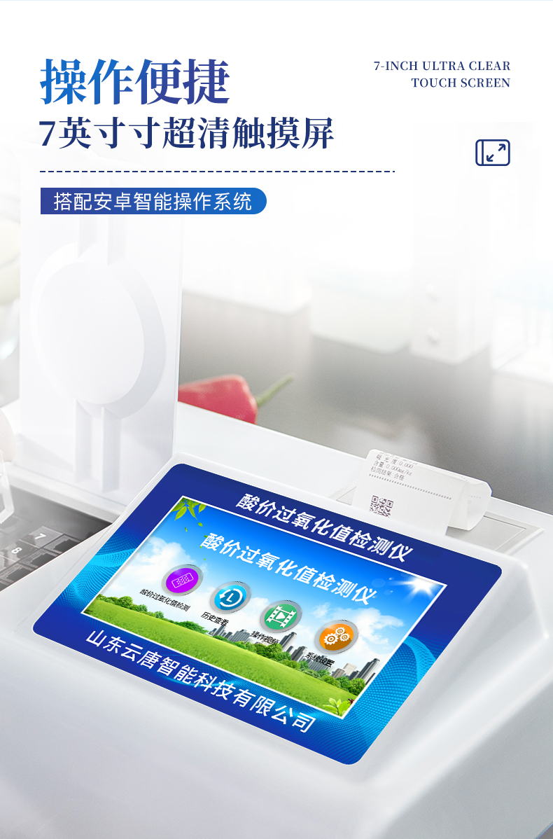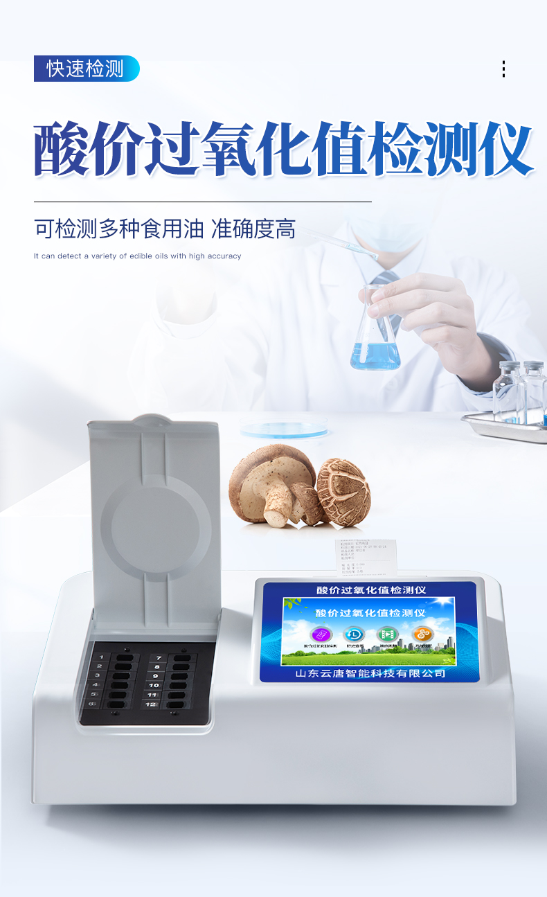 安卓智能操作系統(tǒng),采用更加**和人性化操作,儀器具有網(wǎng)線連接、wifi聯(lián)網(wǎng)上傳、GPRS無(wú)線遠(yuǎn)傳功能,快速上傳數(shù)據(jù)。一體化便攜式快檢設(shè)備,滿足現(xiàn)場(chǎng)及流動(dòng)檢測(cè)使用需求,能夠在同一軟件下實(shí)現(xiàn)所有檢測(cè)項(xiàng)目的檢測(cè),并可通過(guò)同一窗口直觀顯示檢測(cè)結(jié)果。智能化程度高,儀器具有自檢功能:具有開(kāi)機(jī)自檢和調(diào)零功能,具有自動(dòng)檢測(cè)重復(fù)性功能。檢測(cè)通道:≥12個(gè)檢測(cè)通道,可以同時(shí)測(cè)試多個(gè)樣品,每個(gè)樣品由程序控制分別獨(dú)立工作,不會(huì)互相干擾。顯示方式:≥8英寸液晶觸摸屏顯示,人性化中文操作界面,讀數(shù)直觀、簡(jiǎn)單。配備新一代嵌入式熱敏打印機(jī),可選擇手動(dòng)打印或者自動(dòng)打印,檢測(cè)完成可自動(dòng)打印檢測(cè)報(bào)告和二維碼。光源采用進(jìn)口超高亮發(fā)光二極管,高精度、穩(wěn)定性強(qiáng)、光源可控、可以關(guān)掉不使用的光源,功耗更低。采用USB2.0接口設(shè)計(jì),方便數(shù)據(jù)的存貯和移動(dòng),并可隨時(shí)與計(jì)算機(jī)直接相連,并且可用計(jì)算機(jī)控制儀器。實(shí)現(xiàn)數(shù)據(jù)查詢、瀏覽、分析、統(tǒng)計(jì)、打印等。儀器具有品類多種類樣品菜單庫(kù),可靈活選擇檢測(cè)樣品,不同的檢測(cè)通道可同時(shí)檢測(cè)不同的樣品項(xiàng)目。樣品處理簡(jiǎn)單省力,整體操作快速、安全、便捷。儀器具有自身保護(hù)功能,可設(shè)置用戶名及密碼,防止非工作人員操作等。高靈敏度,高檢測(cè)精度,高重復(fù)性精度,掃描式高精度光學(xué)傳感器。過(guò)氧化值檢測(cè)儀器具有重新校準(zhǔn)、鎖定、恢復(fù)出廠設(shè)置功能。結(jié)果判定線可修改,對(duì)照值標(biāo)定值可保存,斷電不丟失數(shù)據(jù)。
