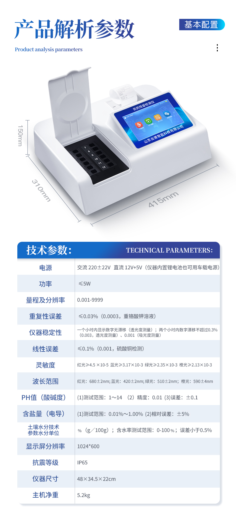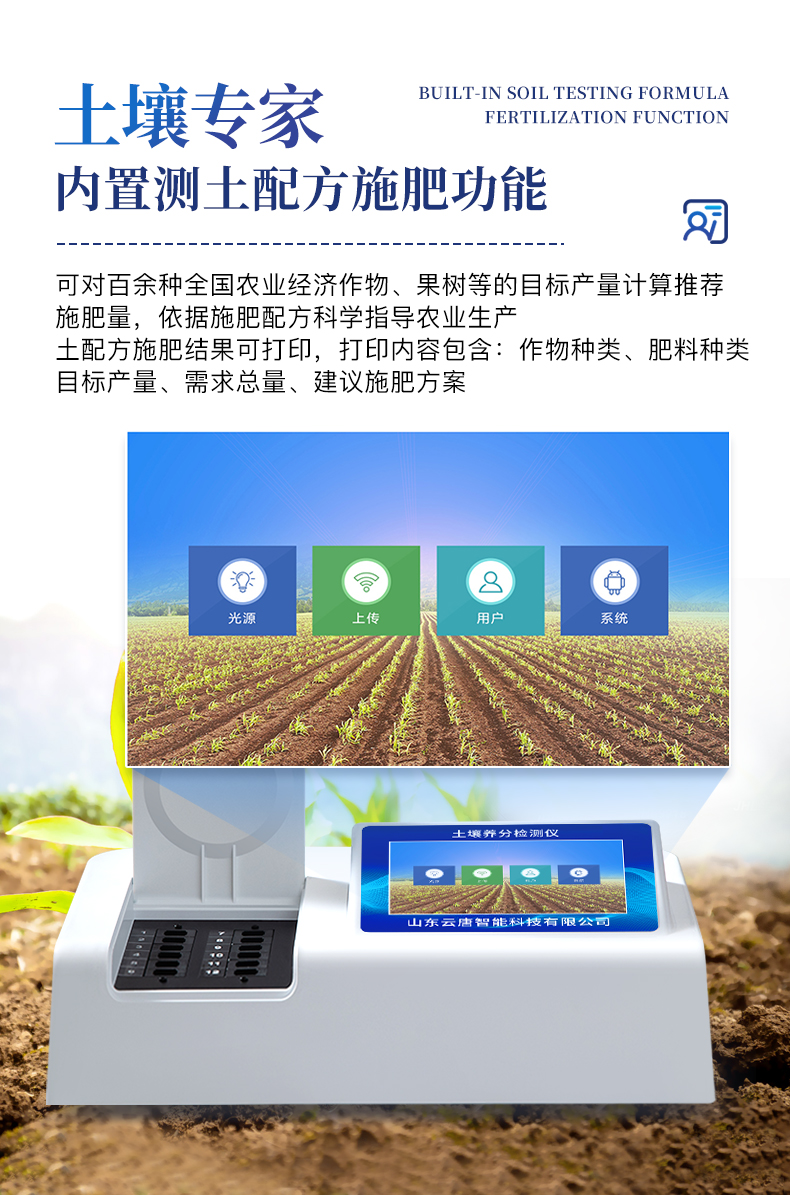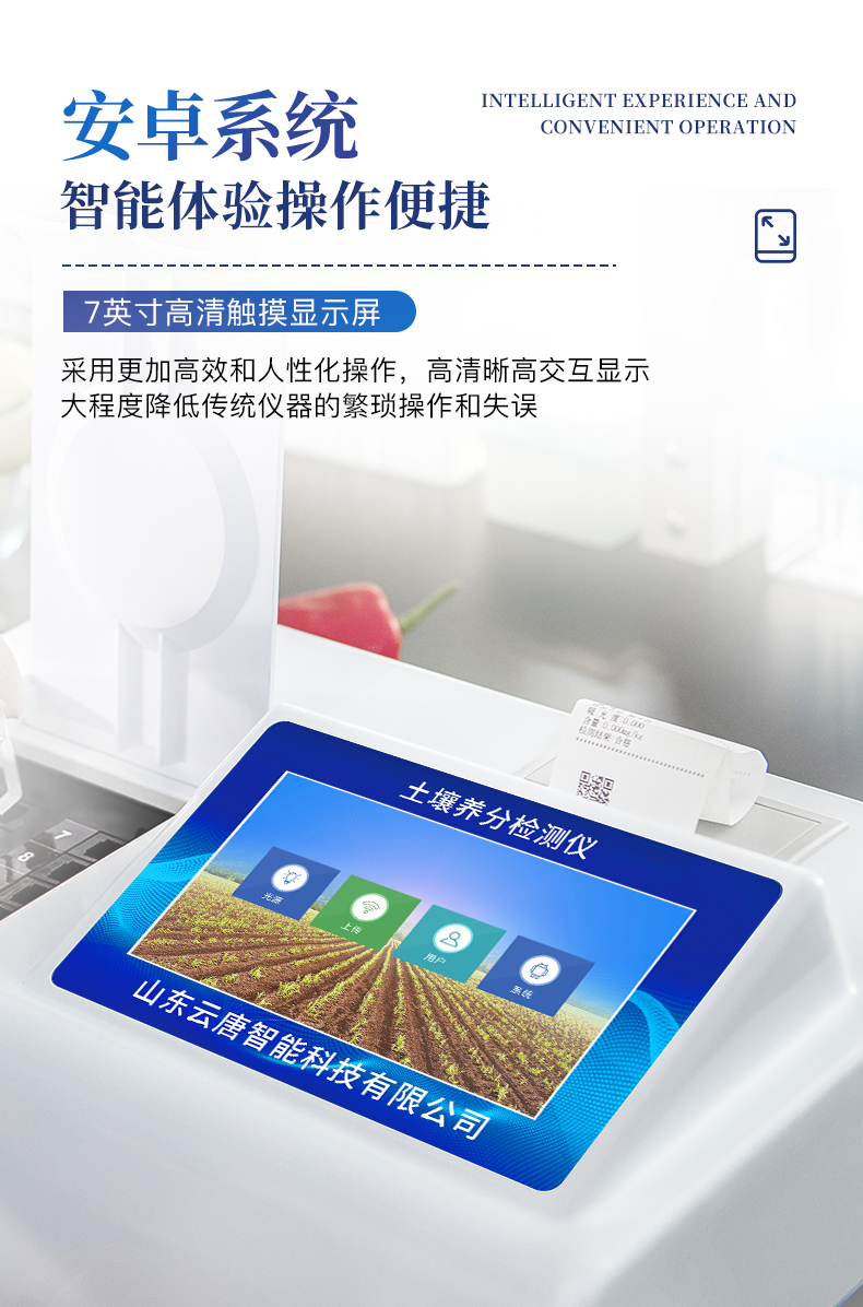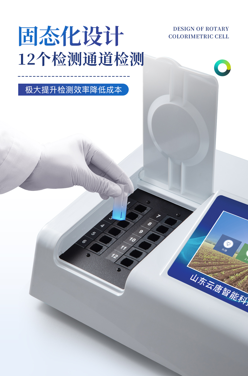 簡介:品牌:云唐? 型號:YT-T4一、臺式土壤養(yǎng)分檢測儀產(chǎn)品簡介:配套齊全:該儀器相當(dāng)于一個小型實(shí)驗(yàn)室,無需用戶自配附件。適于農(nóng)業(yè)服務(wù)部門或農(nóng)資經(jīng)銷商、高教院校、科研院所、合作社、肥料廠商、大種植戶測土施肥和鑒別肥料真假及環(huán)保檢測應(yīng)用。檢測功能全:測試項(xiàng)目國內(nèi)外全面,除標(biāo)配試劑外,其他