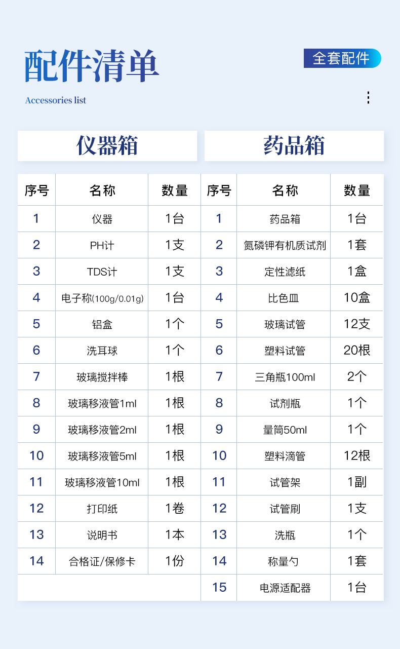 | 2 | PH計(jì) | 1支 | 2 | 氮磷鉀有機(jī)質(zhì)試劑 | 1套 |