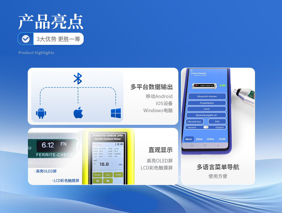 鐵素體含量檢測(cè)儀操作簡(jiǎn)單 List-Magnetik公司 FERRITE-CHECK 140鐵素體含量檢測(cè)儀是一款設(shè)計(jì)緊湊、使用方便的便攜儀器,儀器配有集成探頭,儀器符合Basel標(biāo)準(zhǔn)DIN EN ISO 8249,使用磁感應(yīng)法測(cè)量奧氏體鋼和雙相鋼中的鐵素體含量。 高亮OLED顯示鐵素體含量 FERRITE-CHECK 140鐵素體含量檢測(cè)儀只有一個(gè)按鈕,并配有多語言菜單導(dǎo)航,非常易于使用。高亮度OLED屏顯示FN或Fe%的測(cè)量結(jié)果。 測(cè)量焊縫中的鐵素體含量 特別是對(duì)于焊接的雙相鋼,重要的是要知道焊縫是否有足夠的鐵素體含量來保證焊縫的強(qiáng)度。鐵素體含量低的話,焊縫受熱后較容易產(chǎn)生裂紋,但如果鐵素體含量過高,焊縫的韌性和延展性將會(huì)喪失。 快速連續(xù)鐵素體含量測(cè)量 使用FERRITE-CHECK 140鐵素體含量檢測(cè)儀,可以非常準(zhǔn)確和快速地測(cè)定鐵素體含量。檢測(cè)光滑或拋光表面上的焊縫時(shí),可以將儀器切換到快速連續(xù)測(cè)量模式。當(dāng)探頭放置在表面上并沿表面移動(dòng)時(shí),測(cè)量值將連續(xù)存儲(chǔ),在提起探頭后,屏幕將顯示的*小值、**值和平均值組成的統(tǒng)計(jì)信息。 校準(zhǔn)鐵素體含量檢測(cè)儀 FERRITE-CHECK 140鐵素體含量檢測(cè)儀配有3個(gè)校準(zhǔn)標(biāo)準(zhǔn)片,可追溯到NIST 管理和發(fā)送測(cè)量數(shù)據(jù)與免費(fèi)的應(yīng)用程序 為了進(jìn)一步處理測(cè)量數(shù)據(jù),您可以將FERRITE-CHECK 140鐵素體含量檢測(cè)儀與移動(dòng)Android和iOS設(shè)備配對(duì)?;蛘吲c一臺(tái)Windows電腦通信。這是由低功耗藍(lán)牙技術(shù)(BLE)實(shí)現(xiàn)的。使用Lima Connect應(yīng)用程序,您可以管理項(xiàng)目并在照片上分配測(cè)量點(diǎn)。測(cè)量結(jié)果可以統(tǒng)計(jì)評(píng)估和圖形顯示。這款應(yīng)用適用于安卓、iOS和Windows系統(tǒng),軟件免費(fèi)的。