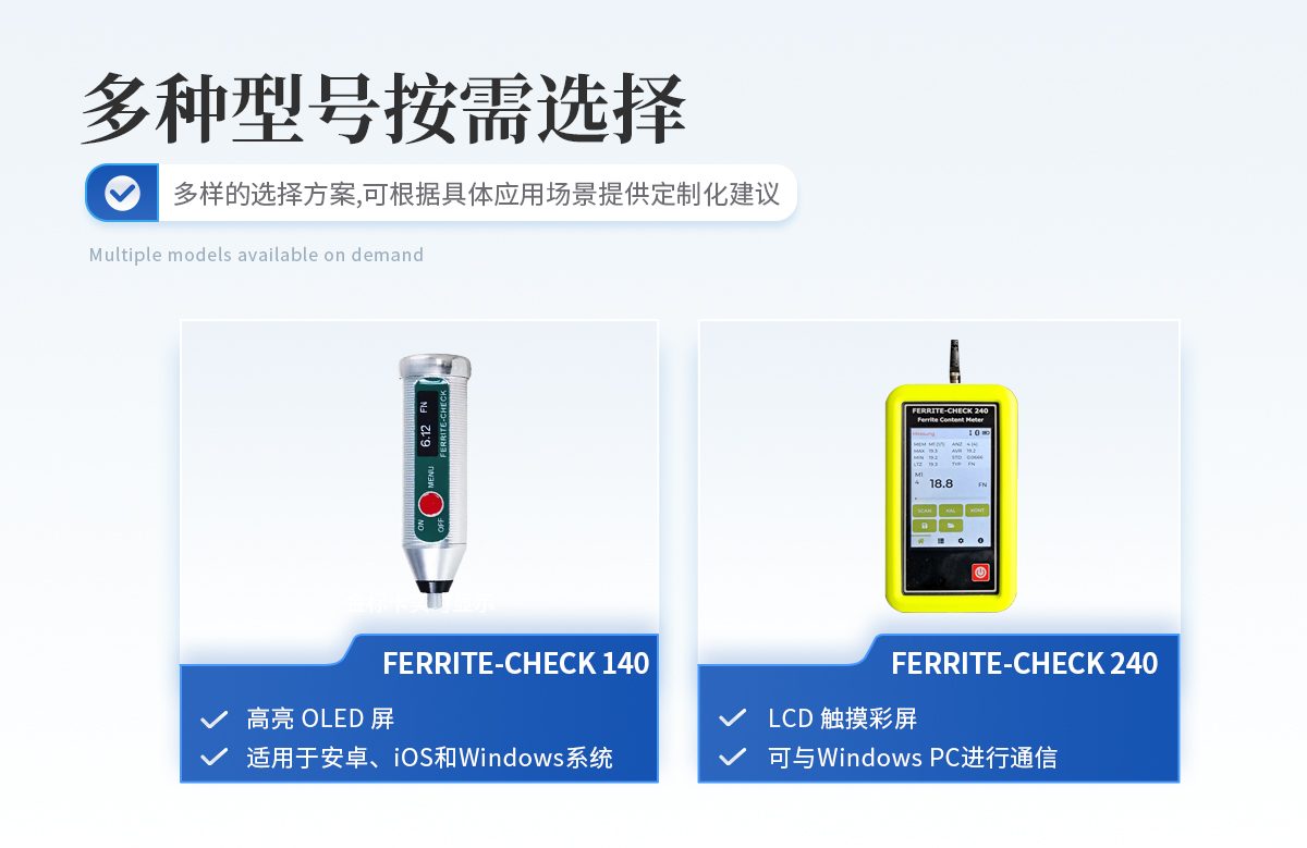 簡(jiǎn)介:儀器介紹:鐵素體含量檢測(cè)儀Ferrite content meter;制造商:德國李斯特(List-Magnetik)性能特點(diǎn):鐵素體含量檢測(cè)儀操作簡(jiǎn)單 List-Magnetik公司 FERRITE-CHECK 140鐵素體含量檢測(cè)儀是一款設(shè)計(jì)緊湊、使用方便的便攜儀器,儀器配有集成探頭,儀器符合Basel標(biāo)準(zhǔn)DIN EN ISO 8249,使用磁感應(yīng)法測(cè)量奧氏體鋼和雙相鋼中的鐵素體含