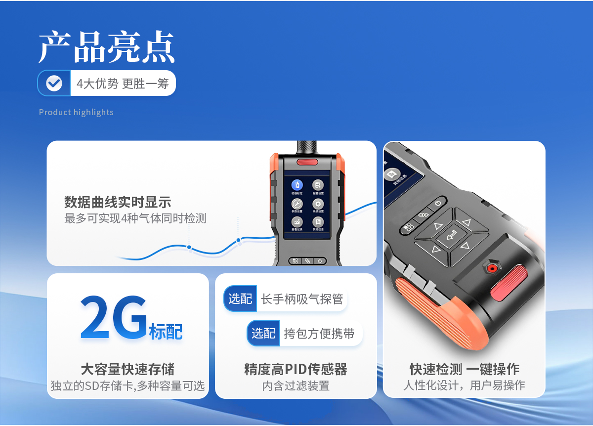 1、快速** 采用原裝進(jìn)口PID傳感器,精度高 儀器內(nèi)含過(guò)濾裝置,**過(guò)濾油、水、粉塵等雜質(zhì) 即使在*嚴(yán)苛的工業(yè)環(huán)境中,檢測(cè)結(jié)果依然可以信賴 2、人性化設(shè)計(jì),用戶易操作 3.5寸高清彩屏,開(kāi)機(jī)即可檢測(cè) 純硬件一鍵開(kāi)關(guān)機(jī), 減小電量消耗 選配長(zhǎng)手柄吸氣探管 選配挎包方便隨身攜帶 “跑車”造型,美觀大方 3、功能全面 同時(shí)顯示實(shí)現(xiàn)數(shù)據(jù)和濃度曲線 配置高低速可調(diào)的氣泵 *多可實(shí)現(xiàn)4種氣體同時(shí)檢測(cè) 可選配外置藍(lán)牙打印機(jī),檢測(cè)數(shù)據(jù)實(shí)現(xiàn)移動(dòng)打印 可選配藍(lán)牙、ZIGBEE等多種無(wú)線通訊方式 支持多種氣體顯示單位任意切換,濃度值由系統(tǒng)自動(dòng)換算 中英文自由切換顯示 大容量快速存儲(chǔ)功能,存儲(chǔ)空間可以定制 Micro-USB接口充電器,方便隨時(shí)充電 安卓手機(jī)通用數(shù)據(jù)線,方便連接電腦讀取歷史數(shù)據(jù) 可以在高溫、高濕、高粉塵環(huán)境氣體檢測(cè)(需配采樣探槍)