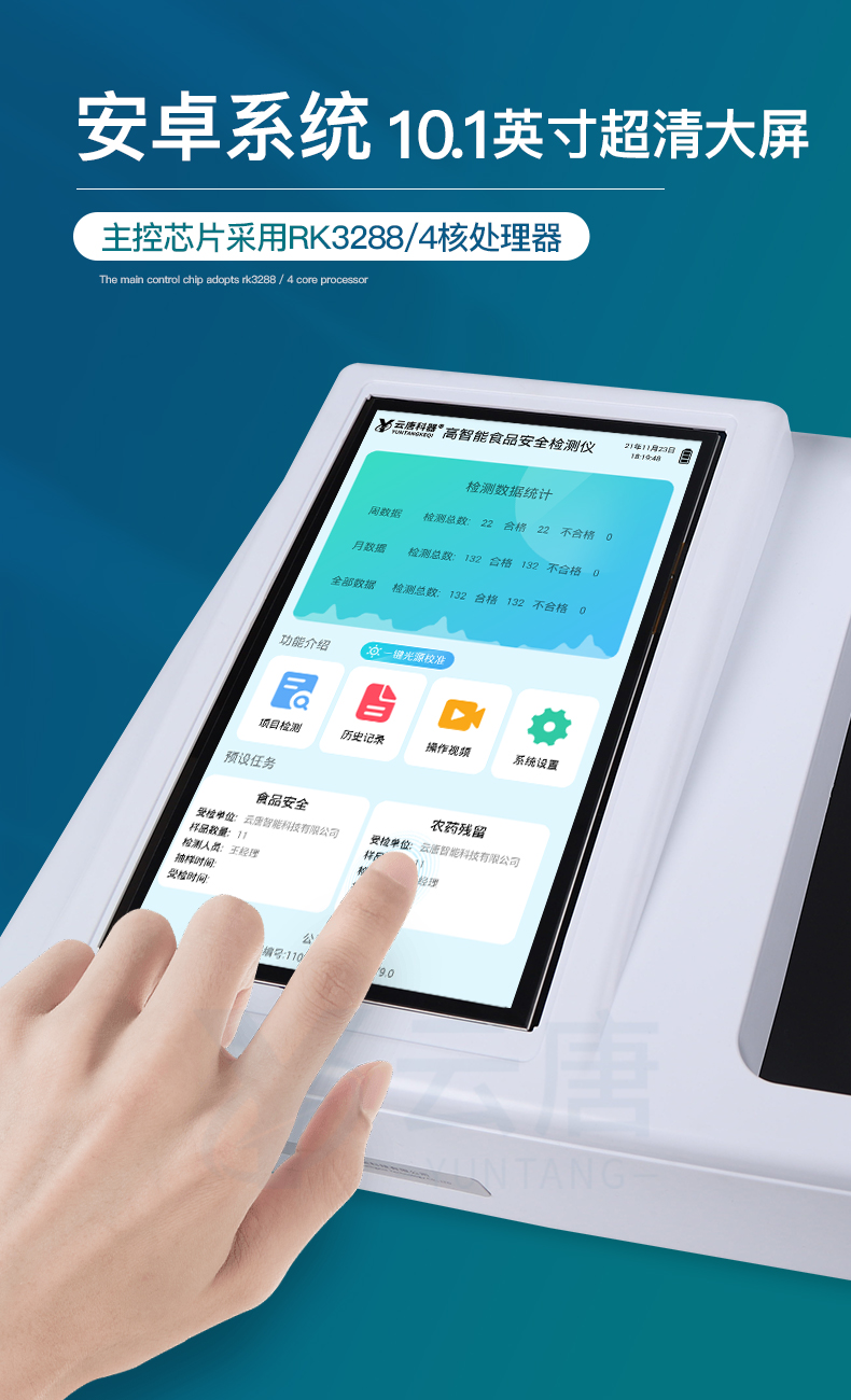 山東云唐智能科技有限公司生產(chǎn)的高智能食品安全檢測儀為集成化食品安全快速檢測分析設備,采用臺式一體化設計,可快速檢測200多種食品安全項目,包含非食用化學物質(zhì)、濫用食品添加劑、農(nóng)藥殘留、獸藥殘留、重金屬、病害肉、營養(yǎng)強化劑、抗生素類殘留、激素類殘留、真菌毒素類殘留、化學類殘留等項目的定性定量檢測。