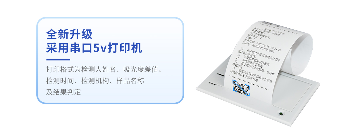 ①采用串口5v打印機(jī),可選擇手動(dòng)打印或者自動(dòng)打印,三分鐘出打印結(jié)果,打印格式為檢測人姓名、吸光度差值、檢測時(shí)間、檢測機(jī)構(gòu)、樣品名稱及結(jié)果判定。