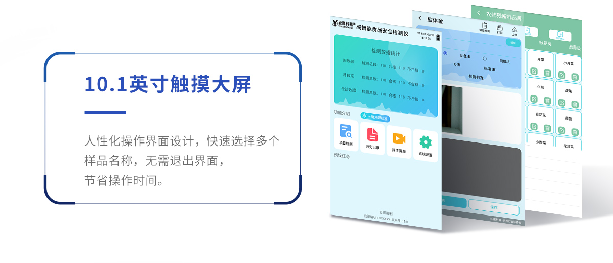 1、儀器采用手提一體化系統(tǒng)檢測(cè)技術(shù),將分光光度模塊、膠體金檢測(cè)模塊、新型農(nóng)殘檢測(cè)模塊、數(shù)字化管理模塊、無(wú)線通訊模塊高度集成于一體,支持檢測(cè)200種食品安全檢測(cè)項(xiàng)目,同時(shí)預(yù)留升級(jí)檢測(cè)方法。