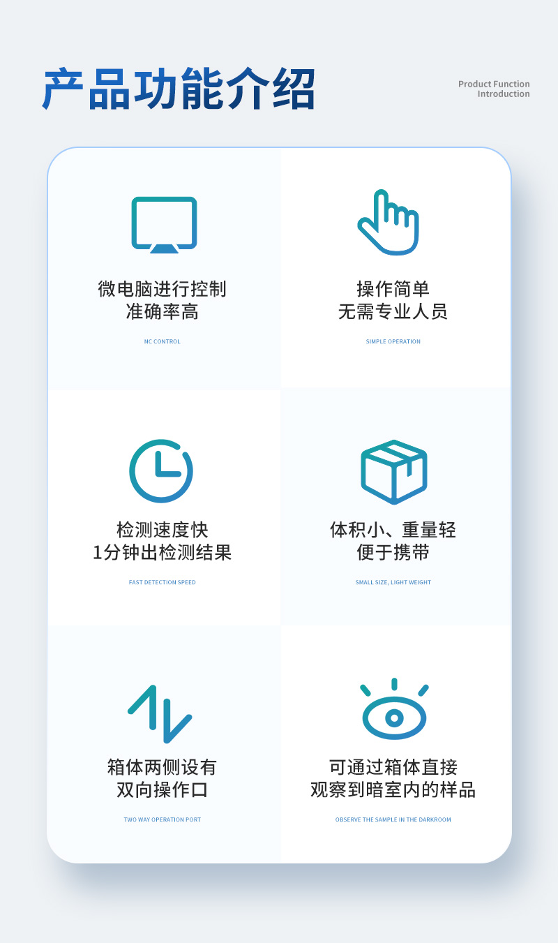 | ★1、采用微電腦進(jìn)行控制,準(zhǔn)確率高 | ★2、操作簡單,無需專業(yè)人員 | ★3、檢測速度快,1分鐘出檢測結(jié)果 | ★4、體積小、重量輕、便于攜帶 |