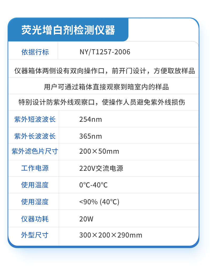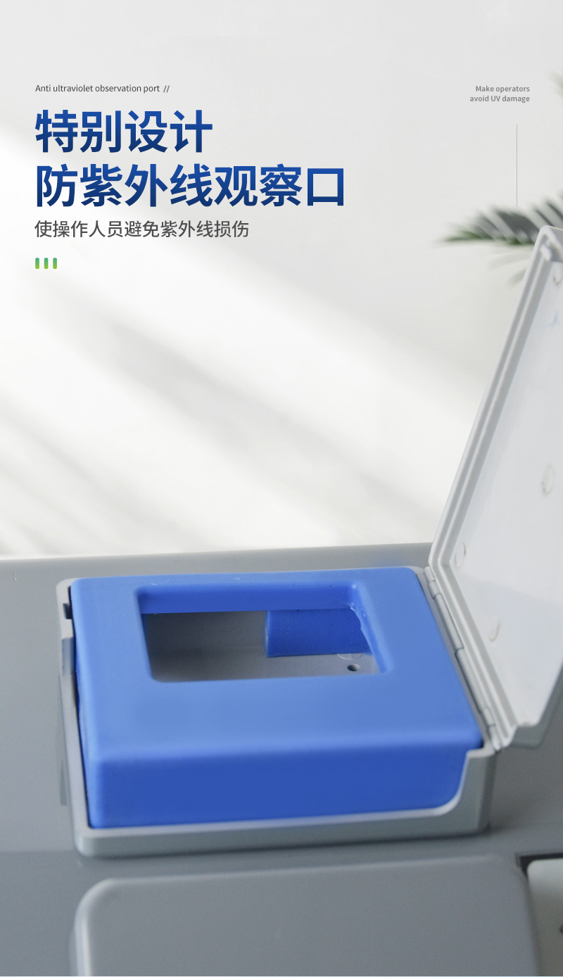 | ★依據(jù)行標(biāo):NY/T1257-2006 | ★儀器箱體兩側(cè)設(shè)有雙向操作口,前開門設(shè)計(jì),方便取放樣品。 | ★用戶可通過箱體直接觀察到暗室內(nèi)的樣品。 | ★特別設(shè)計(jì)防紫外線觀察口,使操作人員避免紫外線損傷。 | ★紫外短波波長:254nm | ★紫外長波波長:365nm | ★可見光源 | ★紫外濾色片尺寸:200×50mm | ★工作電源: 220V交流電源 | ★使用溫度: 0℃-40℃ | ★使用濕度:<90% (40℃) | ★儀器功耗: 20W | ★外型尺寸:300×200×290mm |