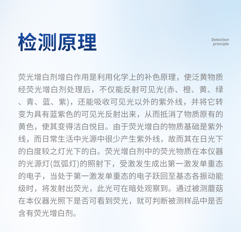 | 熒光增白劑是一種熒光染料,或稱為白色染料,也是一種復(fù)雜的有機(jī)化合物。它的特性是能激發(fā)入射光線產(chǎn)生熒光,使所染物質(zhì)獲得類似熒石的閃閃發(fā)光的效應(yīng),使肉眼看到的物質(zhì)很白,達(dá)到增白的效果;雖然目前沒有證明熒光劑吸收多少會(huì)對(duì)人體造成傷害,但是熒光增白劑已被列為潛在致癌因素之一,嚴(yán)禁在食品加工中使用;近年來,部分經(jīng)銷商為了使一些價(jià)值較高的食用菌(如雙孢蘑菇、雞腿菇)增白、護(hù)色,延長貨架期,在銷售前違法使用熒光增白劑或含有該成分的保鮮劑,造成浸染污染。此外,某些食用菌(如白靈菇),由于所用包裝紙是增白劑處理過的,造成沾染污染。 | 該熒光增白劑檢測儀:依據(jù)農(nóng)業(yè)部行業(yè)標(biāo)準(zhǔn):NY/T1257-2006《食用菌中熒光物質(zhì)的快速檢測》進(jìn)行研發(fā),可廣泛應(yīng)用于食用菌或含有熒光增白劑成分作為保鮮劑的農(nóng)產(chǎn)品質(zhì)量安全的快速檢測;適用于農(nóng)產(chǎn)品檢測單位、工商部門檢測取證,同時(shí)也適用于農(nóng)產(chǎn)品貿(mào)易市場、超市、大中學(xué)校、賓館酒家、以及經(jīng)銷商自檢。 |