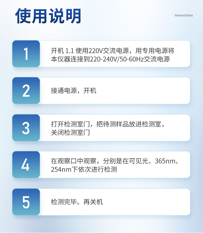 | 1、開機(jī) 1.1 使用220V交流電源,用專用電源將本儀器連接到220-240V/50-60Hz交流電源。 | 2、操作程序 | 2.1 接通電源,開機(jī) | 2.2 打開檢測室門,把待測樣品放進(jìn)檢測室,關(guān)閉檢測室門 | 2.3 在觀察口中觀察,分別是在可見光、365nm、254nm下依次進(jìn)行檢測。 | 2.4 檢測完畢。再關(guān)機(jī)。 |