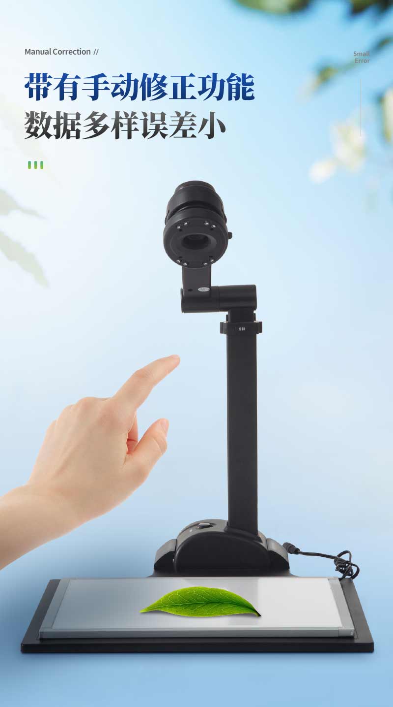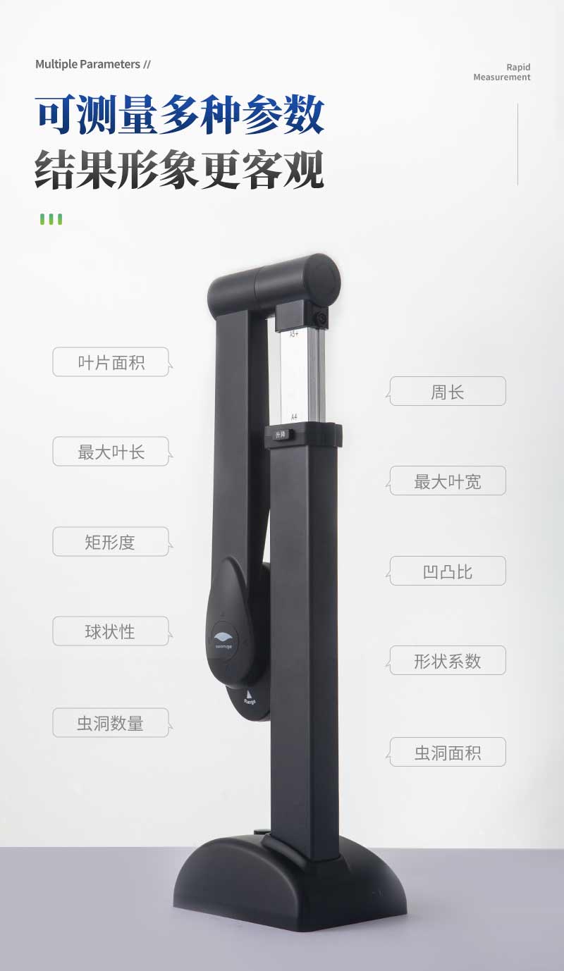 智能拍照式葉面積測量系統(tǒng)由圖像采集儀和裝入自主開發(fā)軟件的平板組成,采用本公司多年積累的面積測量算法,根據(jù)葉片輪廓特征提取、圖形實物轉換、邊緣檢測等技術,能夠形象并快速得到所測葉片面積、周長、蟲洞數(shù)量等參數(shù)。相比傳統(tǒng)的葉面積,具有測量更快速簡便、結果更形象客觀、數(shù)據(jù)多樣并大大減少了人為操作帶來的誤差。