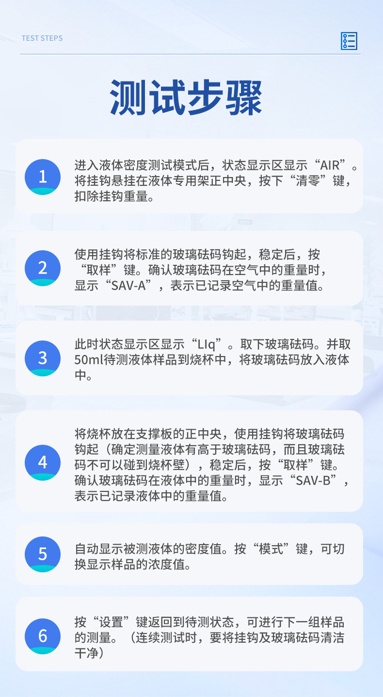 | 1、進入液體密度測試模式后,狀態(tài)顯示區(qū)顯示“AIR”。 將掛鉤懸掛在液體專用架正中央,按下“清零”鍵,扣除掛鉤重量。 | 2、使用掛鉤將標(biāo)準(zhǔn)的玻璃砝碼鉤起,穩(wěn)定后,按“取樣”鍵。確認(rèn)玻璃砝碼在空氣中的重量時,顯示“SAV-A”,表示已記錄空氣中的重量值。 | 3、此時狀態(tài)顯示區(qū)顯示“LIq”。取下玻璃砝碼。并取50ml待測液體樣品到燒杯中,將玻璃砝碼放入液體中。 | 4、將燒杯放在支撐板的正中央,使用掛鉤將玻璃砝碼鉤起(確定測量液體有高于玻璃砝碼,而且玻璃砝碼不可以碰到燒杯壁),穩(wěn)定后,按“取樣”鍵。確認(rèn)玻璃砝碼在液體中的重量時,顯示“SAV-B”,表示已記錄液體中的重量值。 | 5、自動顯示被測液體的密度值。按“模式”鍵,可切換顯示樣品的濃度值。 | 7、按“設(shè)置”鍵返回到待測狀態(tài),可進行下一組樣品的測量。(連續(xù)測試時,要將掛鉤及玻璃砝碼清潔干凈) | 儀器尺寸:195*220*190mm | 包裝尺寸:430*200*360mm | 包裝重量:4kg | 測試時間:約5秒 顯示值: 密度、體積 溫度補償: 溶液溫度可設(shè)定至0~100℃ 溶液補償: 溶液可設(shè)定至19.999 |