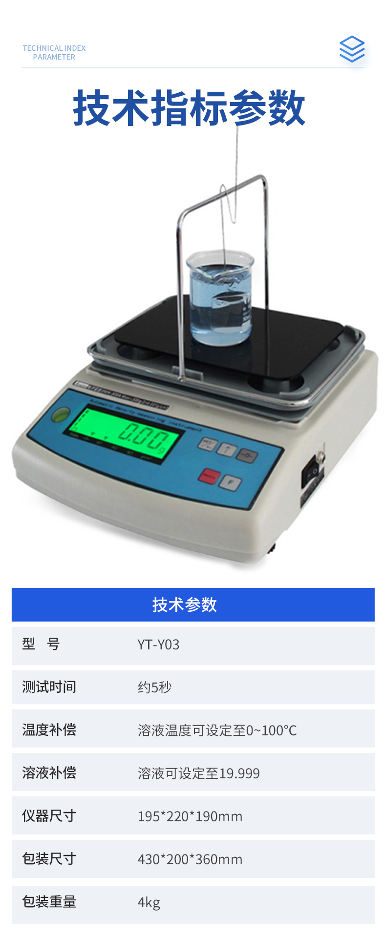 | YT-Y01 稱重范圍:0.01-300g 稱重精度:0.01g 密度精度:0.001g/cm3 | YT-Y02 稱重范圍:0.01-600g 稱重精度:0.01g 密度精度:0.001g/cm3 | YT-Y03 稱重范圍:0.005-300g 稱重精度:0.005g 密度精度:0.0001g/cm3 |