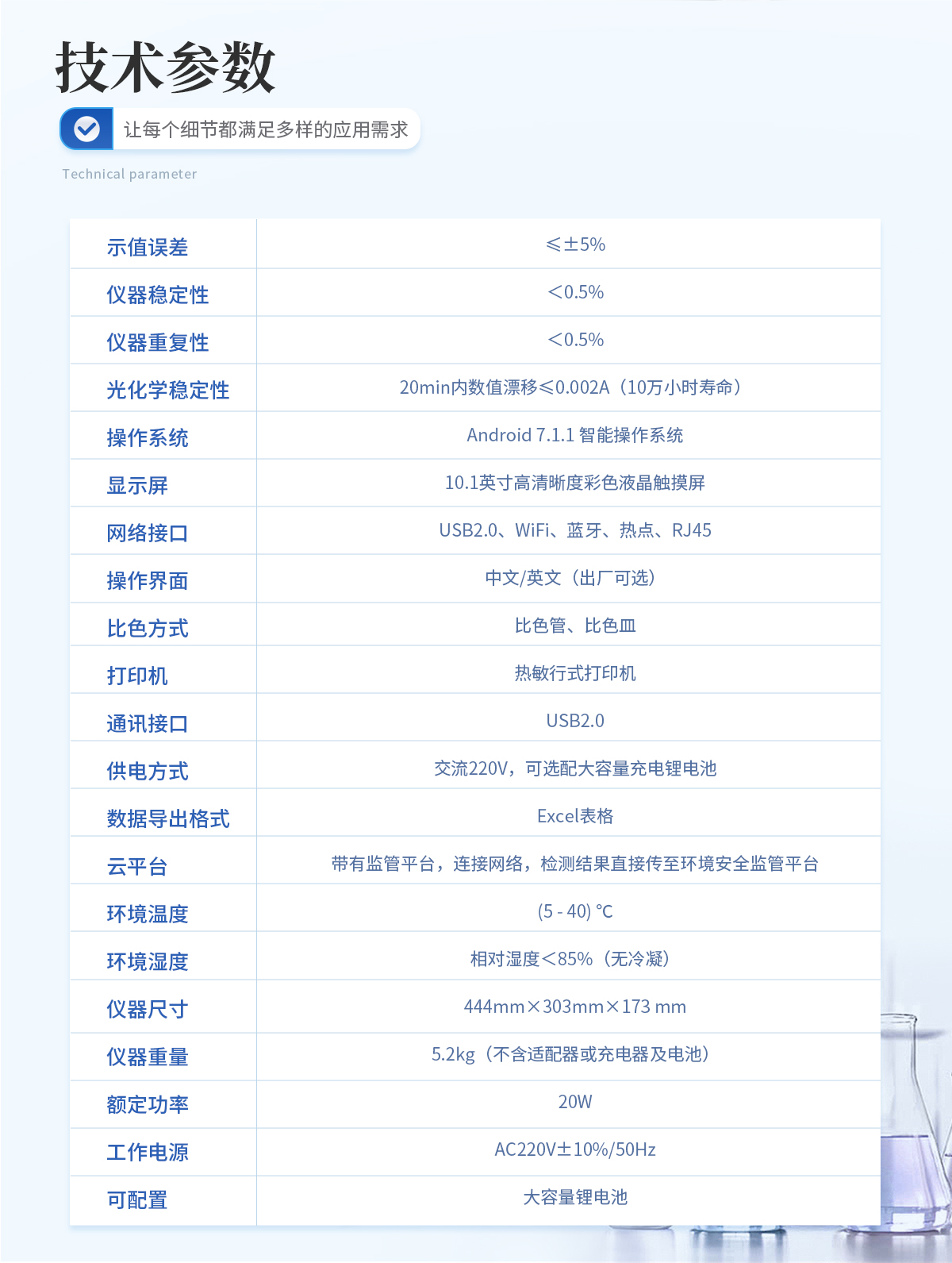 | 示值誤差:≤±5%; | 儀器穩(wěn)定性:<0.5%; | 儀器重復性:<0.5%; | 光化學穩(wěn)定性:20min內數(shù)值漂移≤0.002A(10萬小時壽命); | 檢測量程:0.004-0.05mg/L; | 檢測下限:0.004mg/L; | 分辨率:0.001mg/L; | 比色方式:支持10mm、30mm、40mm、50mm皿比色和φ16mm管比色等比色方式 | 操作系統(tǒng):Android7.1.1智能操作系統(tǒng); | 操作界面:中文或英文操作界面; | 顯示屏:10.1英寸高清晰度彩色液晶觸摸屏; | 網(wǎng)絡接口:USB2.0、HDMI、WiFi、藍牙、熱點、RJ45; | 云平臺:儀器帶有監(jiān)管平臺,連接有線/無線網(wǎng)絡,檢測結果直接傳輸至環(huán)境安全監(jiān)管平臺; | 打印機:熱敏行式打印機; | 數(shù)據(jù)儲存:800萬組,可自由調用查看; | 數(shù)據(jù)導出格式:Excel表格; | 儀器尺寸:367x243x125mm; | 儀器重量:5.3kg; | 環(huán)境溫度:(5-40)℃; | 環(huán)境濕度:相對濕度<85%(無冷凝); | 額定功率:10W; | 工作電源:AC220V±10%/50Hz; | 可配置:大容量鋰電池。 |