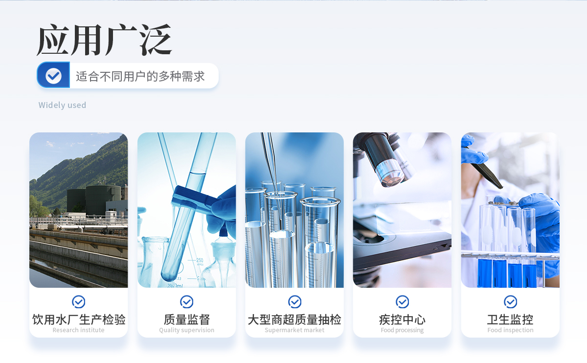 能夠廣泛的應用于飲用水廠生產檢驗、市場監(jiān)督部門質量監(jiān)督、大型商超質量抽檢、疾病控制中心、衛(wèi)生監(jiān)控等。