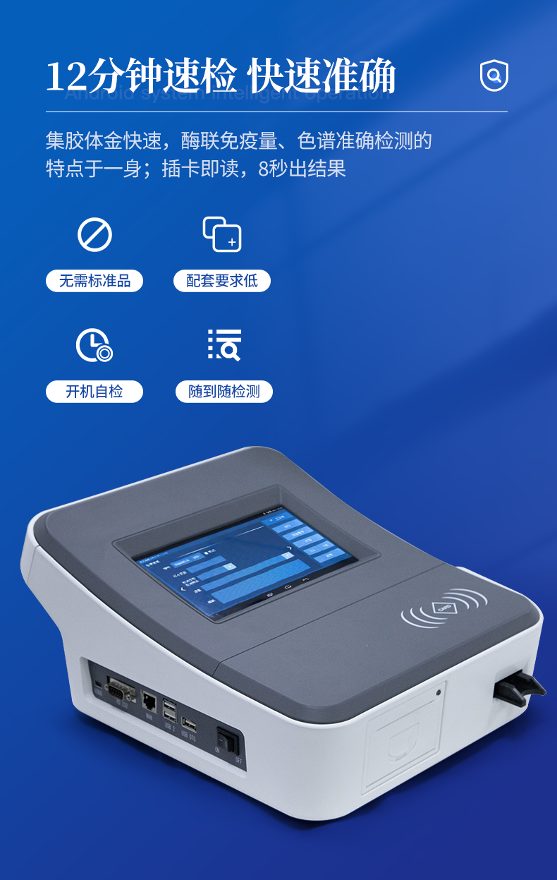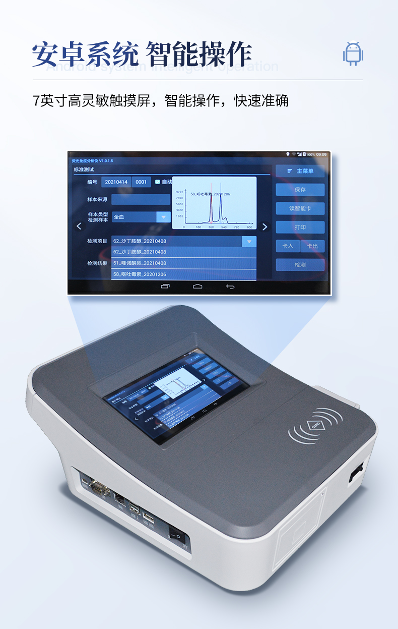1、儀器自動識別檢測卡條形碼上的檢測項目、樣本類型、檢測限、標(biāo)準(zhǔn)曲線,形成完整的檢測數(shù)據(jù)信息鏈。一卡一控,插卡后儀器自動讀取檢測卡顯示的C、T線的熒光信號,依據(jù)檢測卡內(nèi)置的標(biāo)準(zhǔn)曲線,自動計算結(jié)果;用戶可根據(jù)自身需求,選擇設(shè)定檢測限/定量限(內(nèi)控或國家標(biāo)準(zhǔn)限量)。