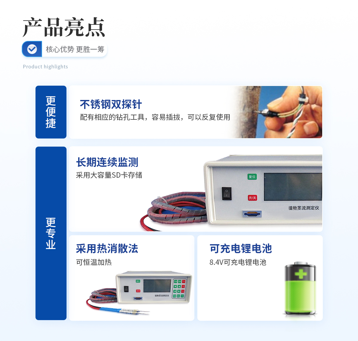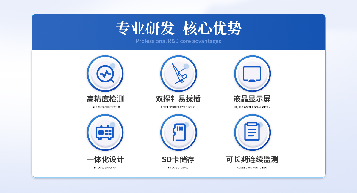 | 雙探針,配有相應(yīng)的鉆孔工具,容易插拔,可以反復(fù)使用 | 采用熱消散法,可恒溫加熱 | 可以長期連續(xù)監(jiān)測 | 不銹鋼探針,采用Teflon涂層,持久耐用 | 采用高精度T型熱電偶直接與數(shù)據(jù)分析儀連接 | 采用大容量SD卡存儲 |
