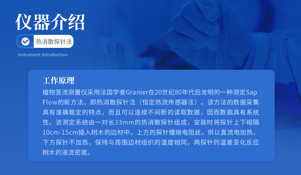 簡介:儀器介紹:植物莖流測量儀采用熱消散探針法測量樹干瞬時莖流密度,可以長期連續(xù)觀測樹木的液流,有利于研究樹木和大氣之間的水分交換規(guī)律,并以此為觀測手段,長期監(jiān)測森林生態(tài)系統(tǒng)對環(huán)境變化的影響。對于造林綠化、森林管理和林業(yè)管理等具有重要的理論指導(dǎo)意義和應(yīng)用價值。工作原理 :植物莖流測量儀采用法國學(xué)者Granier在