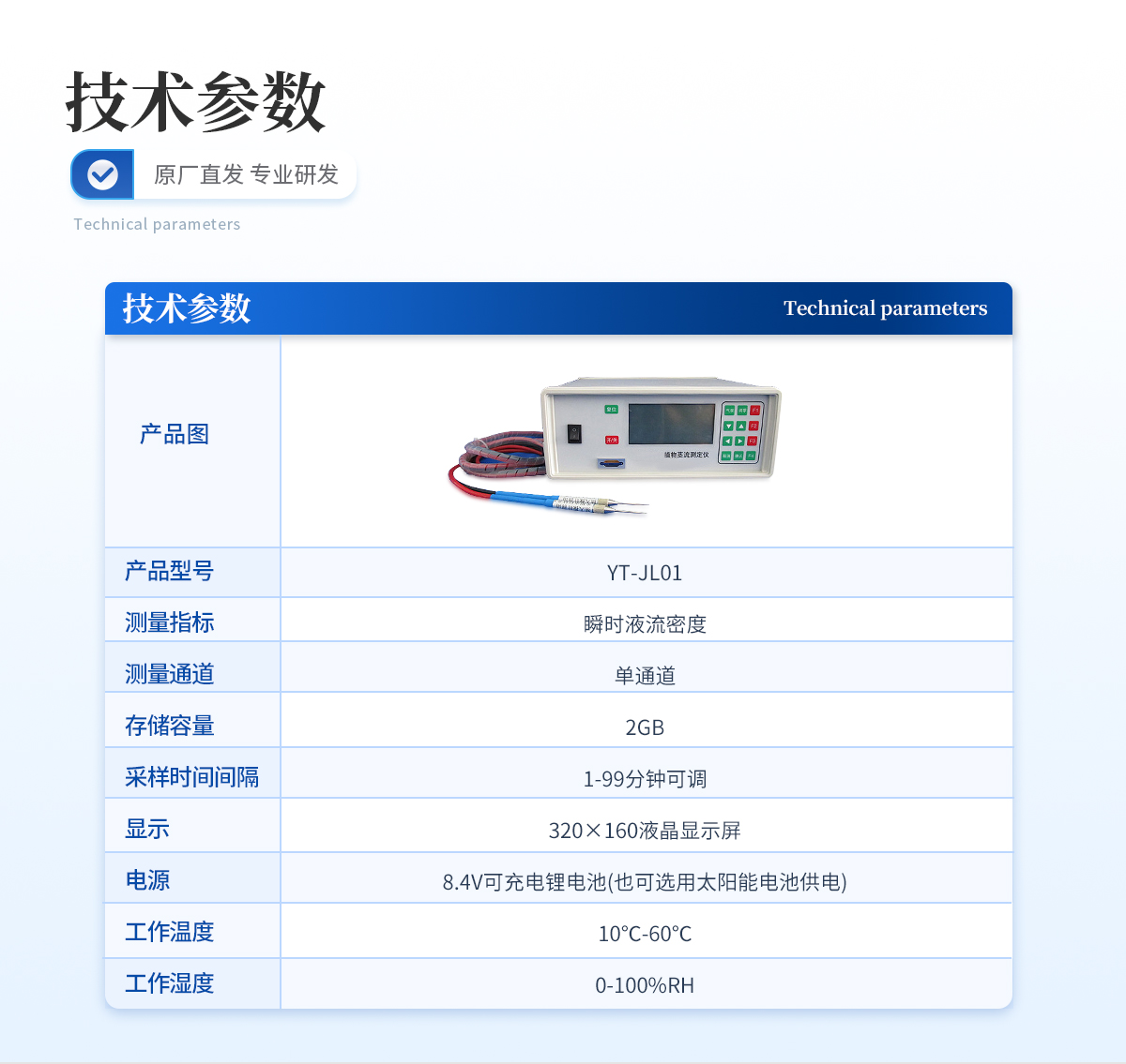 | 測量指標(biāo):瞬時液流密度 | 測量通道:單通道 | 存儲容量:2GB | 采樣時間間隔:1-99分鐘可調(diào) | 顯示:320×160液晶顯示屏 | 電源:8.4V可充電鋰電池(也可選用太陽能電池供電) | 工作溫度:10℃-60℃ | 工作濕度:0-100%RH |